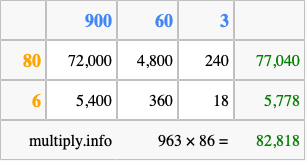 Finally, we add up all the sums we found in step 3 to get our final answer to 963 times 86.
