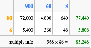 Finally, we add up all the sums we found in step 3 to get our final answer to 968 times 86.