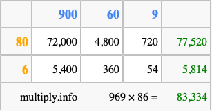 Finally, we add up all the sums we found in step 3 to get our final answer to 969 times 86.