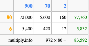 Finally, we add up all the sums we found in step 3 to get our final answer to 972 times 86.