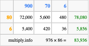 That's all there is to it! As you can see from the box above, the answer to 976 times 86 using the box method is 83,936.