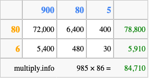 Finally, we add up all the sums we found in step 3 to get our final answer to 985 times 86.