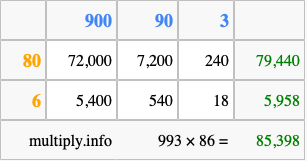 Below is an illustration showing you how to calculate 993 times 86 using the box method, using the instructions above.