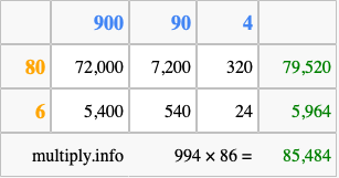 Finally, we add up all the sums we found in step 3 to get our final answer to 994 times 86.