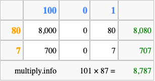 That's all there is to it! As you can see from the box above, the answer to 101 times 87 using the box method is 8,787.