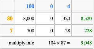 Finally, we add up all the sums we found in step 3 to get our final answer to 104 times 87.