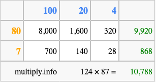 Finally, we add up all the sums we found in step 3 to get our final answer to 124 times 87.
