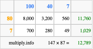 Finally, we add up all the sums we found in step 3 to get our final answer to 147 times 87.