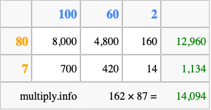 Finally, we add up all the sums we found in step 3 to get our final answer to 162 times 87.
