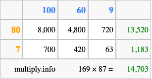 Finally, we add up all the sums we found in step 3 to get our final answer to 169 times 87.