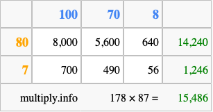 Finally, we add up all the sums we found in step 3 to get our final answer to 178 times 87.