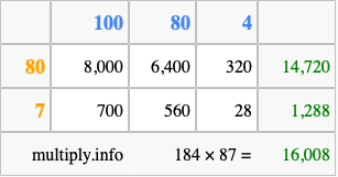 Finally, we add up all the sums we found in step 3 to get our final answer to 184 times 87.