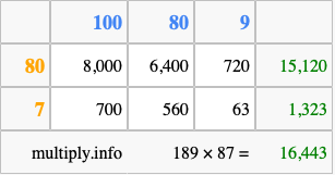 Finally, we add up all the sums we found in step 3 to get our final answer to 189 times 87.