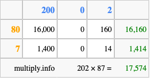 That's all there is to it! As you can see from the box above, the answer to 202 times 87 using the box method is 17,574.