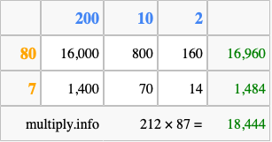 That's all there is to it! As you can see from the box above, the answer to 212 times 87 using the box method is 18,444.