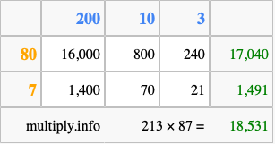 Finally, we add up all the sums we found in step 3 to get our final answer to 213 times 87.