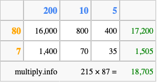 That's all there is to it! As you can see from the box above, the answer to 215 times 87 using the box method is 18,705.