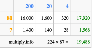 Finally, we add up all the sums we found in step 3 to get our final answer to 224 times 87.