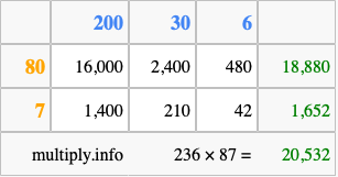 Finally, we add up all the sums we found in step 3 to get our final answer to 236 times 87.