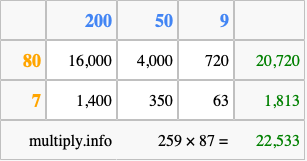 Finally, we add up all the sums we found in step 3 to get our final answer to 259 times 87.