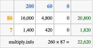 Finally, we add up all the sums we found in step 3 to get our final answer to 260 times 87.