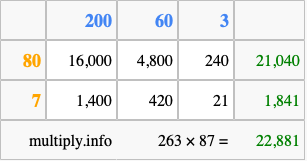 That's all there is to it! As you can see from the box above, the answer to 263 times 87 using the box method is 22,881.