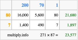 That's all there is to it! As you can see from the box above, the answer to 271 times 87 using the box method is 23,577.