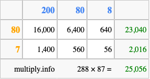 Finally, we add up all the sums we found in step 3 to get our final answer to 288 times 87.
