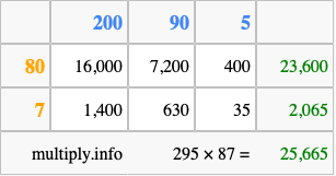 Finally, we add up all the sums we found in step 3 to get our final answer to 295 times 87.
