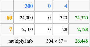 Finally, we add up all the sums we found in step 3 to get our final answer to 304 times 87.