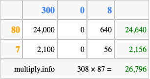 Finally, we add up all the sums we found in step 3 to get our final answer to 308 times 87.