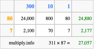 Finally, we add up all the sums we found in step 3 to get our final answer to 311 times 87.