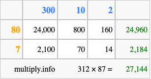 Finally, we add up all the sums we found in step 3 to get our final answer to 312 times 87.