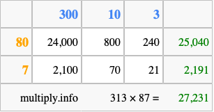 Finally, we add up all the sums we found in step 3 to get our final answer to 313 times 87.