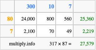 Finally, we add up all the sums we found in step 3 to get our final answer to 317 times 87.