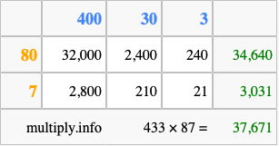 Finally, we add up all the sums we found in step 3 to get our final answer to 433 times 87.