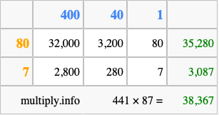 That's all there is to it! As you can see from the box above, the answer to 441 times 87 using the box method is 38,367.