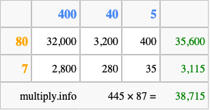 Finally, we add up all the sums we found in step 3 to get our final answer to 445 times 87.