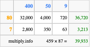 Finally, we add up all the sums we found in step 3 to get our final answer to 459 times 87.