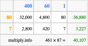 Finally, we add up all the sums we found in step 3 to get our final answer to 461 times 87.