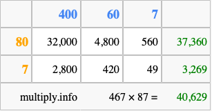 Finally, we add up all the sums we found in step 3 to get our final answer to 467 times 87.