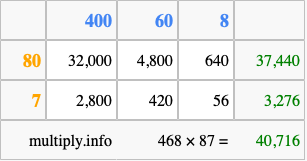 Finally, we add up all the sums we found in step 3 to get our final answer to 468 times 87.