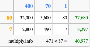 Finally, we add up all the sums we found in step 3 to get our final answer to 471 times 87.