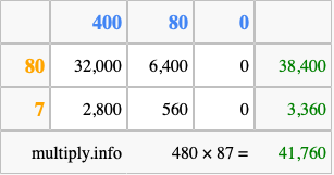 Finally, we add up all the sums we found in step 3 to get our final answer to 480 times 87.