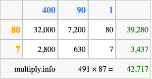 Finally, we add up all the sums we found in step 3 to get our final answer to 491 times 87.