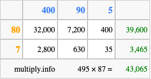 Finally, we add up all the sums we found in step 3 to get our final answer to 495 times 87.
