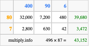 Finally, we add up all the sums we found in step 3 to get our final answer to 496 times 87.