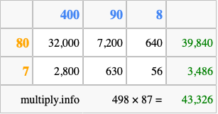 Finally, we add up all the sums we found in step 3 to get our final answer to 498 times 87.
