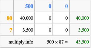 That's all there is to it! As you can see from the box above, the answer to 500 times 87 using the box method is 43,500.