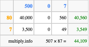Finally, we add up all the sums we found in step 3 to get our final answer to 507 times 87.